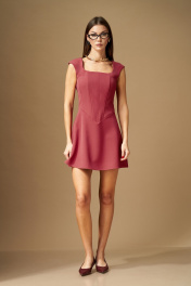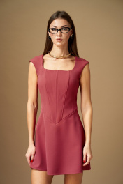 Платье женское приталенного силуэта, отрезное по талии, спереди углом. Верхняя часть переда платья выполнена ввиде корсета, плотно прилегает, в рельефы вставлены косточки, на подкладке. Вырез фигурный, квадратной формы, плечо слегка расширено. Нижняя часть ввиде короткой юбки – расширенного А-силуэта. По центру спинки вставлена потайная молния, так же для лучшего прилегания в верхней части есть бочок и вытачка. Ширина изделия на уровне глубины: 42р – 41см, 44р – 43см, 46р – 45см, 48р – 47см; Ширина по линии талии: 42р – 33см, 44р – 35см, 46р – 37см, 48р – 39см; Ширина по линии бедер: 42р – 47см, 44р – 49см, 46р – 51см, 48р – 53см; Длина по среднему шву спинки: 42-46р - 79см, 48р – 84см; Ширина спинки: 42-46р - 36см, 48р – 38см; Ширина плеча: 42-46р - 10,5см, 48р – 12см.