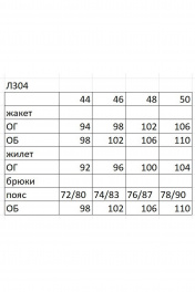 Костюм трех предметный, состоит из жакета, жилета и брюк. Жакет на подкладке, приталенного силуэта с центральной бортовой застежкой на петли и пуговицы, с отрезным бочком . По переду прорезные карманы с клапаном, спинка со средним швом и вытачками. Рукав втачной двухшовный со шлицами-обманками на петли и пуговицы. Жилет на подкладке полуприлегающего силуэта с V-образным вырезом и центральной застежкой на пуговицы. Перед с отрезными бочками и имитацией карманов с листочками, низ фигурный. Спинка со средним швом и хлястиком по центральной части спинки. Брюки-палаццо широкие на притачном поясе и боковыми карманами, застежка брюк на тесьму молнию и пуговицу. Длина жакета 68см, длина жилета 47см, длина брюк 112 см. Л304 44 46 48 50 жакет ОГ 94 98 102 106 ОБ 98 102 106 110 жилет ОГ 92 96 100 104 брюки пояс 72/80 74/83 76/87 78/90 ОБ 98 102 106 110