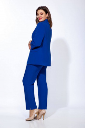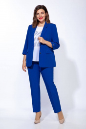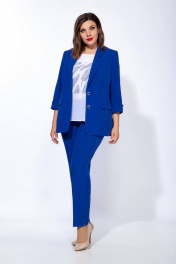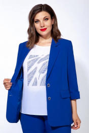 Стильный комплект состоящий из жакета, брюк и блузы. Жакет полуприлегающего силуэта, на подкладке с застежкой на 2 пуговицы. Рукав трехчетвертной с манжетами. По переду обработаны карманы с клапанами. Блуза с цельнокроенным коротким рукавом. Брюки чуть заужен к низу, на поясе и с застежкой на пуговицу и тесьму-молнию. Длина жакета по ср.шву 71 см, длина рукава 46см. Длина блузки 67 см. Длина брюк 100 см