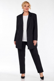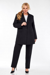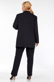 Элегантный удлиненный жакет, прямого кроя, застежкой на 2 пуговицы. По переду прорезные карманы с листочкой. Жакет на подкладке из 100% п/э, по переду рельефы, по спинке рельефные швы. Рукава втачные двухшовные. Блузка прямого силуэта, с округлым вырезом горловины, с нагрудными вытачками, без рукава, с разрезами в боковых швах. Брюки слегка заужены к низу, на притачном поясе на резинке. Внизу шлицы по боковому шву. Длина жакета- 80см, длина рукава- 60см, длина блузки- 66 см, длина брюк- 106 см
