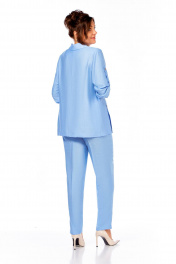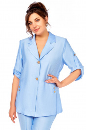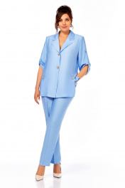 Жакет полуприлегающего силуэта, с пиджачным воротником, застежка на две пуговицы. На полочке шлицы с декоративными шлицами. Спинка со средним швом. Рукав втачной, длиной три четверти, регулируется патой. Брюки прямые, пояс на резинке, карманы в боковых швах. Длина жакета 70см, длина рукава 47см. Длина брюк 109см