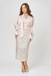 Блузка выполнена из мягкой струящейся ткани с матовым блеском. Стойка и V-образный вырез горловины. Блузка прямого силуэта, с отрезными кокетками на полочке, от которых заложена сборка, застежка на пуговицы. Разрезы по боковым швам. Рукав одношовный, с манжетой фигурной формы. Сьемное украшение выполнено из бусин, сьемное. В комплекте галстук-пояс. Длина блузки 63.5см, длина рукава 63см С961 52 54 56 ОГ 114 118 122 ОБ 118 122 126 Обхват рукава 42 44 46