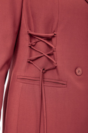 Костюм полуприлегающего силуэта. Элегантный костюм с интересным кроем не оставит Вас равнодушной. Жакет на подкладке с воротником пиджачного типа. Срез борта фигурной формы. По переду рельефы, между которыми декоративный элемент в виде шнуровки. Прорезные карманы в рамку, спинка со средним швом и рельефами. Рукав длинный двухшовный. Брюки слегка расклешенные, на поясе, с застежкой на молнию и петлю и пуговицу. По спинке пояс на резинке. Заутюженные канты по передним и задним полотнищам. Карманы к боковым швам. Длина жакета 67см, длина рукава 61,5см, длина брюк 112см