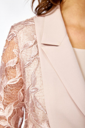 Комплект женский, нарядный, состоящий из жакета, брюк и блузки. Стильный жакет полуприлегающего силуэта с пиджачным воротником, с застежкой на одну пуговицу. Жакет выполнен из сочетания двух тканей- кружево и однотон. Спинка со средним швом. Рукав из кружевной ткани, длиной три четверти. Блузка без рукавов, с округлым вырезом горловины. По переду нагрудные вытачки. Брюки прямые, со стрелками, на поясе. По спинке пояс на резинке. Длина жакета 69см, длина рукава 48см, длина брюк 112см