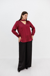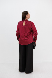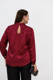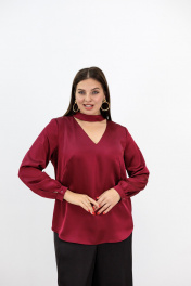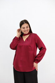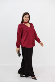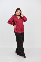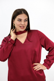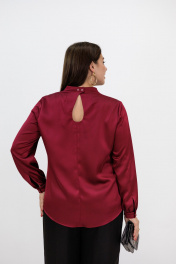 Блуза женская, прямого силуэта. Модель выполнена из высококачественного двухстороннего атласа с мягким фактурным в винном цвете. Вырез горловины V-образный. Акцентом модели служит воротник-чокер, фиксирующийся сзади на две блузочные кнопки. Спинка со средним швом и вырезом «капелька». Рукав длинный, втачной, с манжетой, застёгивающейся на кнопки. Низ изделия с плавным скруглением к боковым швам. Модель прекрасно подойдёт как акцент в нарядном образе.
