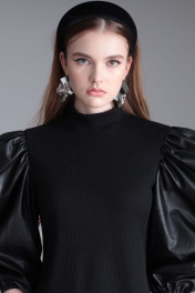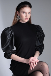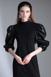 Платье выполнено из эластичного рельефного трикотажного полотна с рукавами из экокожи. Платье полуприлегающего силуэта, слегка расширенное к низу, воротник стойка. Рукав-буфы со сборкой по окату и внизу собран на резинку. Длина платья по центру спинки для размеров 42,44,46 92см, для размеров 48,50,52 95см. Длина рукава 50см.