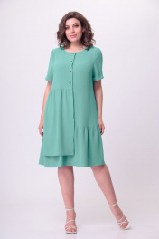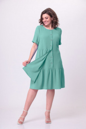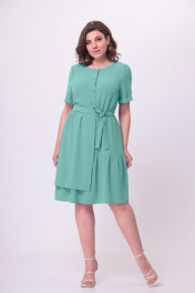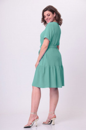 Платье А-образного силуэта (расширенное к низу), выполнено из однотонной стрейчевой плательной ткани. Расширение к низу достигается за счет волана. Платье втачного покроря с цетрально-бортовой застежкой на петли пуговицы до волана. Рукава короткие с манжетой (цельнокроеной). Спинка целая с притачным воланом. Перед ассиметричный: левая часть переда цельная с воланом по низу, правая с подрезной линией по талии, в которую вставлен отлетной волан. На переде расположены нагрудные вытачки идущие из боковых швов. В боковых швах расположены карманы. Дополнением к платью служит пояс из основной ткани. Длина платья по среднему шву: 100 см Длина рукава: 25 см