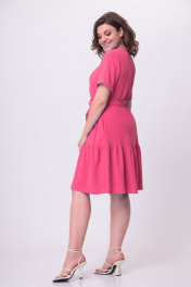 Платье А-образного силуэта (расширенное к низу), выполнено из однотонной стрейчевой плательной ткани. Расширение к низу достигается за счет волана. Платье втачного покроря с цетрально-бортовой застежкой на петли пуговицы до волана. Рукава короткие с манжетой (цельнокроеной). Спинка целая с притачным воланом. Перед ассиметричный: левая часть переда цельная с воланом по низу, правая с подрезной линией по талии, в которую вставлен отлетной волан. На переде расположены нагрудные вытачки идущие из боковых швов. В боковых швах расположены карманы. Дополнением к платью служит пояс из основной ткани. Длина платья по среднему шву: 100 см Длина рукава: 25 см