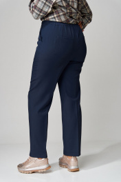 Комплект женский, состоящий из рубашки и брюк. Рубашка свободной формы, покроя спущенное плечо, с центрально-бортовой застежкой на петли-пуговицы (цельнокроеная планка). Горловина оформлена стояче-отложным воротником с отрезной стойкой. Рукав двушовный, низ оформлен манжетой, застегивающейся на пуговицу. В боковых швах расположены небольшие разрезы закругленной формы. На спинке расположена горизонтальная кокетка, на нижней части спинки заложена встречная складка. На переде расположены накладные карманы с клапанами. Брюки классические, заужены книзу, со стрелками по передней и задней половинке. Верхний срез обработан поясом с резинкой по спинке. В боковых швах передних половинок расположены наклонные карманы. На задних половинках расположены талиевые вытачки и накладные карманы. Рубашка: Ширина изделия на уровне глубины: 50р – 64см, 52р – 66см, 54р – 68см. Ширина по линии бедер: 50р – 66см, 52р – 68см, 54р – 70см. Длина по среднему шву спинки: 78-79см. Ширина спинки: 41,5см. Ширина плеча: 21см. Ширина рукава под проймой: 50р – 20см, 52р – 21см, 54р – 22см. Длина рукава: 61см. Брюки: Ширина по линии талии: 50р – 40см, 52р – 42см, 54р – 44см. Ширина по линии бедер: 50р – 55см, 52р – 57см, 54р – 59см. Длина по боковому шву: 101см. Ширина брючины внизу: 50р – 20,5см, 52р – 21,5см, 54р – 22,5см. Высота посадки: 37см. Длина по внутреннему шву: 74см.