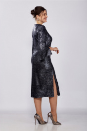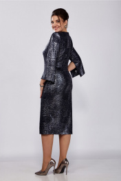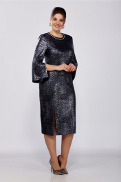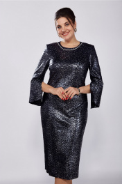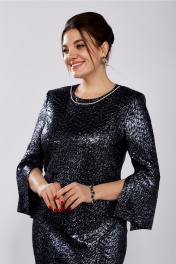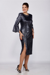 Платье женское, полуприлегающего силуэта, втачного покроя. Выполнено из трикотажного плательного полотна с блеском. Горловина округлой формы, задекорирована отделочной тесьмой по форме горловины переда. Спинка с талиевыми вытачками и средним швом, в котором расположена тесьма-молния. Рукава 7/8 с разрезом по шву до локтя. По переду расположены нагрудные вытачки и подрез закругленной формы, переходящий в разрез. Платье по фигуре и книзу заужено. Ширина изделия на уровне глубины: р50 – 51,5см, р52 – 53,5см, р54 – 55,5см, р56 – 57,5см, р58 – 59,5см, р60 – 61,5см; Ширина по линии талии: р50 – 46см, р52 – 48см, р54 – 50см, р56 – 52см, р58 – 54см, р60 – 56см; Ширина по линии бедер: р50 – 54см, р52 – 56см, р54 – 58см, р56 – 60см, р58 – 62см, р60 – 64см; Длина по среднему шву спинки: р50-54 – 112см, р56-60 –113см; Ширина спинки: р50-54 – 40,5см, р56-60 – 43см; Ширина плеча: р50-54 – 11см, р56-60 – 11,5см; Ширина рукава под проймой: р50- 18см, р52 – 19см, р54 – 20см, р56 – 20см, р58 – 21см, р60 – 22см; Длина рукава: 52см.
