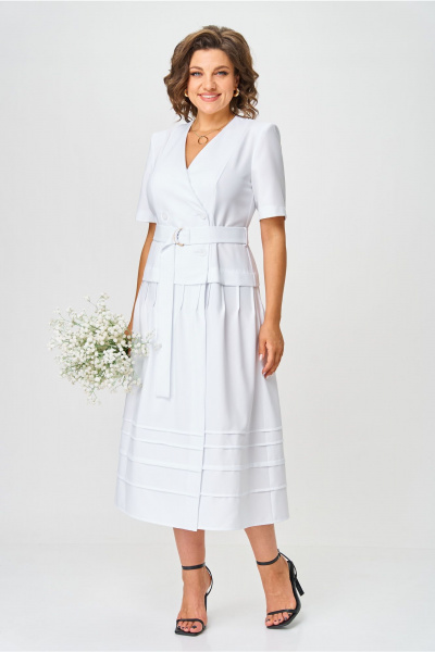 Платье женское полуприлегающего силуэта, с имитацией жакета, с двубортной застежкой на петли-пуговицы. По переду «V-образный» вырез и рельефные линии от плеча. Спинка с двумя рельефами, рядом настрачиваются шлевки, шлевки так же в боковых швах. Юбка в платье с вертикальными защипами сверху и горизонтальными по всей ширине низа платья. Рукав втачной, короткий. К платью прилагается пояс из основной ткани, с полукольцами на конце. Ширина изделия на уровне глубины: р46 – 49см, р48 – 51см, р50 – 53см, р52 – 55см, р54 – 57см, р56 – 59см; Ширина по линии талии: р46 – 43см, р48 – 45см, р50 – 47см, р52 – 49см, р54 – 51см, р56 – 53см; Ширина по линии бедер: р46 – 52см, р48 – 54см, р50 – 56см, р52 – 58см, р54 – 60см, р56 – 62см; Длина по среднему шву спинки: р46-50 – 124см, р52-56 – 125см; Ширина спинки: Ширина плеча: р46-50 – 13см, 52-56 – 14см; Длина рукава: р46-50 – 28см, р52-56 – 30см; Ширина рукава под проймой: р46 – 17,5см, р48 – 18,5см, р50- 19,5см, р52– 20,5см, р54 – 21,5см, р56 – 22,5см.