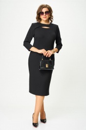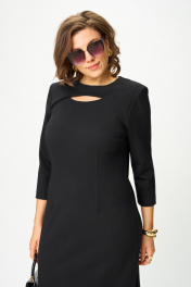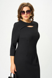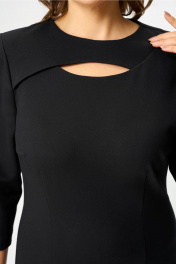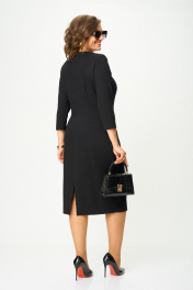 Платье женское, полуприлегающего силуэта, втачного покроя рукава, выполнено из трикотажного полотна. По переду расположены талиевые и нагрудные вытачки, горловина округлой формы с пересекающейся кокеткой, которая образует фигурный вырез. Спинка со средним швом, заканчивающимся разрезом снизу и застегивающимся на навесную петлю-пуговицу сверху, а так же талиевые вытачки. Рукава ¾ одношовные. Ширина изделия на уровне глубины: 48р – 49,5см, 50р – 51,5см, 52р – 53,5см, 54р – 55,5см, 56р – 57,5см, 58р – 59,5см; Ширина по линии талии: 48р – 42см, 50р – 44см, 52р – 46см, 54р – 48см, 56р – 50см, 58р – 52см; Ширина по линии бедер: 46р – 52см, 48р – 54см, 50р – 56см, 52р – 58см, 54р – 60см, 56р – 62см; Длина по среднему шву спинки: 48-52р – 109см, 54-58р – 110см; Ширина спинки: 48-52р – 39см, 54-58р – 41см; Ширина плеча: 48-52р – 11см, 54-58р – 12см; Ширина рукава под проймой: 46р – 17см, 48р – 18см, 50р – 19см, 52р – 20см, 54р – 21см, 56р – 22см; Длина рукава: 48-58р – 48см.