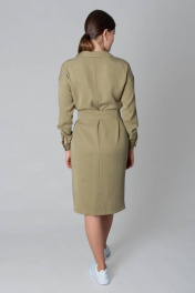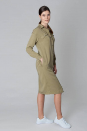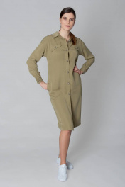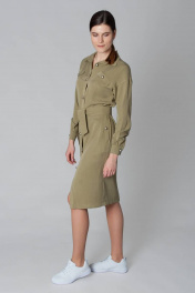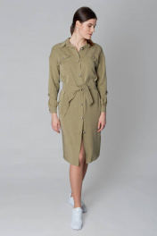 Платье-рубашка из тенсела цвета хаки в стиле сафари, прямого силуэта с длинным рукавом на манжетах. Воротник стояче-отложной. Карманы в боковых швах, застёжка по центру переда на пуговицы. Пояс к комплекте.