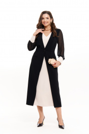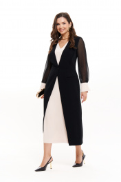 Женское нарядное платье— идеальный выбор для тех, кто ищет базовый элемент гардероба с элегантным классическим стилем. Это свободное платье с имитацией платья-жакета выполнено из струящейся ткани, придающей образу легкость и утонченность. Модель полуприлегающего силуэта отлично подходит как для повседневного ношения, так и для делового или офисного дресс-кода. Черно-бежевое сочетание делает платье нарядным и универсальным: вы можете надеть его как на деловую встречу, так и на вечерний выход. Летний и весенний сезоны — идеальное время для этого наряда, ведь он обеспечивает комфорт благодаря легким материалам и V-образной горловине. Рукава выполнены из шифона и дополнены манжетами с пуговицами, что добавляет женственности и изящества. Платье отрезное по талии, с вытачками и рельефами, подчеркивает силуэт, а скрытая застежка-молния делает посадку особенно аккуратной. Нижняя часть дополнена карманами и шлицей для удобства движений. Благодаря своей универсальности, это офисное платье также отлично впишется в повседневный гардероб современной женщины. Женское платье легко адаптируется под разные стили — от делового до нарядного, оставаясь при этом классическим и женственным. В нем вы всегда будете выглядеть актуально, уверенно и со вкусом. 44 Платье: Длина изделия по спинке - 122см, Длина рукава - 61см, Ширина плеча - 12см, Ширина по бедрам - 52см, Ширина по груди - 49см, Ширина по талии - 40см, Ширина рукава вверху - 19см, Ширина рукава внизу - 11.5см, Ширина спинки - 37.5см; 46 Платье: Длина изделия по спинке - 123см, Длина рукава - 61см, Ширина плеча - 12.3см, Ширина по бедрам - 54см, Ширина по груди - 51см, Ширина по талии - 42см, Ширина рукава вверху - 20см, Ширина рукава внизу - 11.8см, Ширина спинки - 38.5см; 48 Платье: Длина изделия по спинке - 123см, Длина рукава - 61см, Ширина плеча - 12.5см, Ширина по бедрам - 56см, Ширина по груди - 53см, Ширина по талии - 44см, Ширина рукава вверху - 20.5см, Ширина рукава внизу - 12см, Ширина спинки - 39.5см; 50 Платье: Длина изделия по спинке - 123см, Длина рукава - 61см, Ширина плеча - 12.7см, Ширина по бедрам - 58см, Ширина по груди - 55см, Ширина по талии - 46см, Ширина рукава вверху - 21см, Ширина рукава внизу - 12.2см, Ширина спинки - 40.5см;