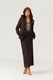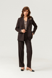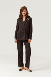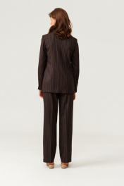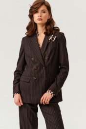 Жакет женский из поливискозной ткани с рисунком в полоску. Жакет прямого силуэта. Жакет двубортный на две обметанные петли и пуговицы. Перед имеет два прорезных кармана с клапаном и двумя обтачками, а также нагрудный карман с листочкой и декоративным шейным платком. На переде располагается две талиевые вытачки. Жакет имеет отрезной бочок. Спинка со средним швом и двумя вертикальными рельефами, идущими от линии плеча до линии низа. Горловина обработана пиджачным воротником. Рукава втачные длинные, низ рукава обработан шлицей с застежкой на обметанные петли и пуговицы. Жакет на подкладке с дизайнерским принтом. Данный жакет подойдет для любого рода мероприятий, в нем вы обязательно затмите всех своим стилем и красотой. Жакет коричневого оттенка можно сочетать с брюками из этой же коллекции. 52 Жакет: Длина изделия - 71см, Длина рукава - 63см, Ширина плеча - 12.2см, Ширина по бедрам - 60см, Ширина по груди - 56см, Ширина рукава - 20.7см;
