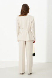 Эти женские брюки выполнены из костюмной поливискозной ткани светло-бежевого цвета, идеально подходящие для повседневных образов. Их классический крой и нейтральный оттенок делают их универсальным элементом гардероба. Верхний срез брюк обработан притачным поясом с застежкой на крючок и молнией в среднем шве, что обеспечивает надежную посадку и аккуратный внешний вид. Брюки оснащены шлевками, позволяющими дополнительно регулировать посадку по талии. Задняя часть украшена четырьмя талиевыми вытачками, которые создают хорошую посадку и подчеркивают фигуру. В боковых швах расположены карманы с подкройным бочком, обеспечивающие функциональность и удобство. Брюки имеют прямой силуэт, что делает их универсальными для различных стилей и ситуаций. Модель на поливискозной подкладке обеспечивает комфорт и приятное ощущение при носке. Эти брюки — отличный выбор для повседневных образов, сочетая стиль, комфорт и практичность. 44 Брюки: Высота посадки - 31см, Длина брюк с поясом - 116см, Длина по шаговому шву - 86см, Ширина брючин сверху - 65см, Обхват брюк по низу - 54.5см, Ширина по бедрам - 48см, Ширина по поясу - 38.5см; 46 Брюки: Высота посадки - 31.5см, Длина брюк с поясом - 116см, Длина по шаговому шву - 86см, Ширина брючин сверху - 67см, Обхват брюк по низу - 55.5см, Ширина по бедрам - 50см, Ширина по поясу - 40.5см; 48 Брюки: Высота посадки - 32см, Длина брюк с поясом - 116см, Длина по шаговому шву - 86см, Ширина брючин сверху - 69см, Обхват брюк по низу - 56.5см, Ширина по бедрам - 52см, Ширина по поясу - 42.5см; 52 Брюки: Высота посадки - 33см, Длина брюк с поясом - 116см, Длина по шаговому шву - 86см, Ширина брючин сверху - 73см, Обхват брюк по низу - 58.5см, Ширина по бедрам - 56см, Ширина по поясу - 48.5см; 54 Брюки: Высота посадки - 33.5см, Длина брюк с поясом - 116см, Длина по шаговому шву - 86см, Ширина брючин сверху - 75см, Обхват брюк по низу - 59.5см, Ширина по бедрам - 58см, Ширина по поясу - 50.5см;