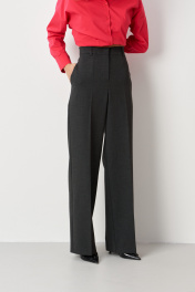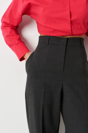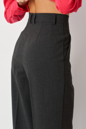 Эти женские брюки выполнены из костюмной поливискозной ткани графитового цвета, идеально подходящей для повседневных образов. Их классический крой и нейтральный оттенок делают их универсальным элементом гардероба. Верхний срез брюк обработан притачным поясом с застежкой на крючок и молнией в среднем шве, что обеспечивает надежную посадку и аккуратный внешний вид. Брюки оснащены шлевками, позволяющими дополнительно регулировать посадку по талии. Задняя часть украшена четырьмя талиевыми вытачками, которые создают хорошую посадку и подчеркивают фигуру. В боковых швах расположены карманы с подкройным бочком, обеспечивающие функциональность и удобство. Брюки имеют прямой силуэт, что делает их универсальными для различных стилей и ситуаций. Модель на поливискозной подкладке обеспечивает комфорт и приятное ощущение при носке. Эти брюки — отличный выбор для повседневных образов, сочетая стиль, комфорт и практичность. 44 46 48 50 54