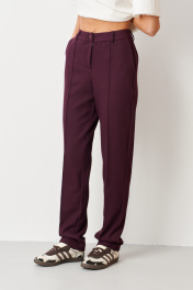 Женские прямые брюки из мягкого трикотажа, бордового цвета. Классические прямые брюки из мягкого и эластичного трикотажного полотна — идеальный выбор для повседневного комфорта и стильного образа. Верхний срез обработан притачным поясом с застежкой на два крючка и скрытой молнией в среднем шве. Модель оснащена боковым карманом с подкройным бочком, а на задней части расположены две талиевые вытачки и два аккуратных прорезных кармана с обтачками, придающих брюк классический вид. Благодаря сочетанию классического кроя и мягкой ткани, брюки прекрасно сочетаются с любой верхней одеждой, становясь универсальной основой для офисных и повседневных образов. Глубокий бордовый оттенок добавляет изысканности и свежести вашему гардеробу. 44 Брюки: Высота посадки - 26.5см, Длина брюк с поясом - 105см, Длина по внутреннему шву - 79см, Ширина брючин сверху - 61.5см, Обхват брюк по низу - 35см, Ширина по бедрам - 47.5см, Ширина по талии - 34.5см; 46 Брюки: Высота посадки - 27см, Длина брюк с поясом - 105см, Длина по внутреннему шву - 79см, Ширина брючин сверху - 63.5см, Обхват брюк по низу - 35.5см, Ширина по бедрам - 49.5см, Ширина по талии - 36.5см; 48 Брюки: Высота посадки - 27.5см, Длина брюк с поясом - 105.5см, Длина по внутреннему шву - 79см, Ширина брючин сверху - 65.5см, Обхват брюк по низу - 36см, Ширина по бедрам - 51.5см, Ширина по талии - 38.5см; 50 Брюки: Высота посадки - 28см, Длина брюк с поясом - 105.5см, Длина по внутреннему шву - 79см, Ширина брючин сверху - 67.5см, Обхват брюк по низу - 36.5см, Ширина по бедрам - 53.5см, Ширина по талии - 41см; 52 Брюки: Высота посадки - 28.5см, Длина брюк с поясом - 106см, Длина по внутреннему шву - 79см, Ширина брючин сверху - 69.5см, Обхват брюк по низу - 37.5см, Ширина по бедрам - 55.5см, Ширина по талии - 43.5см; 54 Брюки: Высота посадки - 28.5см, Длина брюк с поясом - 106см, Длина по внутреннему шву - 79см, Ширина брючин сверху - 71.5см, Обхват брюк по низу - 38см, Ширина по бедрам - 57.5см, Ширина по талии - 45.5см;