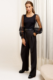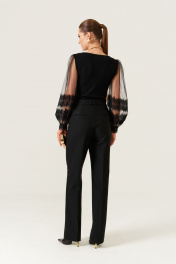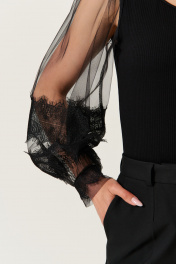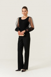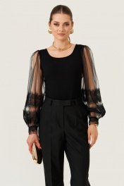 Женское боди из трикотажного полотна с высоким содержанием вискозы, выполненное в элегантном и современном стиле. Модель отличается расширенной горловиной, которая придает образу легкую непринужденность и комфорт. Низ боди отрезной из сетчатого материала с застежкой на кнопки по низу обеспечивает удобство при надевании и снятии изделия, а также добавляет оригинальности дизайну. Рукава втачные из сетчатого материала украшены декоративным кружевом, что создает нежный и женственный образ. Обработка низ рукава выполнена притачной манжетой с застежкой на петли и пуговицы, что обеспечивает аккуратный внешний вид и комфорт при носке. Это стильное и практичное изделие чёрного оттенка идеально подойдет для создания как повседневных, так и более нарядных образов. 44 Джемпер: ; 46 Джемпер: ;