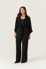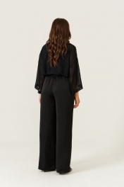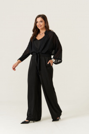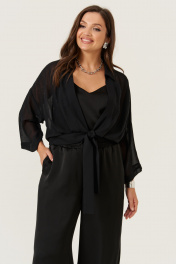 Эта женская блузка выполнена из легкой и мягкой струящейся ткани, идеально подходящей для повседневных образов. Модель обладает прямым силуэтом, обеспечивающим комфорт и стильный внешний вид. Цвет — классический черный, что делает блузку универсальной и легко сочетаемой с различными вещами. Край борта обработан планкой, а перед украшен декоративными стразами, придающими изделию изящность и немного нарядности. Передняя часть оформлена складками, что добавляет объем и интересный визуальный эффект. Низ изделия обработан притачным поясом, который завязывается для дополнительной фиксации и акцента на талии. Горловина выполнена в рубашечном стиле с отрезной стойкой, создавая аккуратный и классический силуэт. Рукава втачные, длинные, украшены декоративными стразами. Линия плеча спущена, что придает рукавам свободный и комфортный крой. Эта блузка станет отличным выбором для повседневных прогулок или неформальных встреч, добавляя вашему стилю нотки утонченности и современности. 46 Блузка: Длина изделия по спинке - 48см, Длина рукава - 33см, Ширина плеча - 26см, Ширина по груди - 57см, Ширина рукава вверху - 22см, Ширина рукава внизу - 23.5см; 48 Блузка: Длина изделия по спинке - 48см, Длина рукава - 33см, Ширина плеча - 26.5см, Ширина по груди - 59см, Ширина рукава вверху - 22.5см, Ширина рукава внизу - 24см; 50 Блузка: Длина изделия по спинке - 48см, Длина рукава - 33см, Ширина плеча - 27см, Ширина по груди - 61см, Ширина рукава вверху - 23см, Ширина рукава внизу - 24.5см; 52 Блузка: Длина изделия по спинке - 49см, Длина рукава - 33см, Ширина плеча - 28см, Ширина по груди - 63см, Ширина рукава вверху - 23.5см, Ширина рукава внизу - 25см;