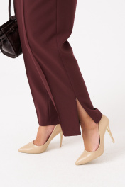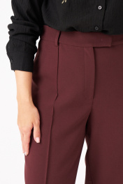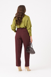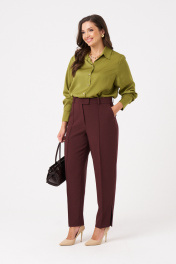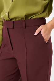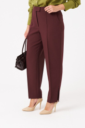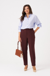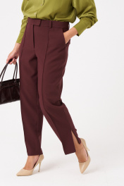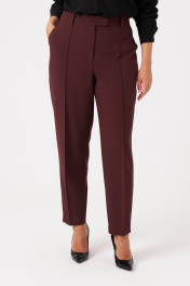 Женские брюки из поливискозной ткани классического коричневого цвета. Модель выполнена с притачным поясом, украшенным шлевками, что позволяет носить их как с ремнем, так и без него. Застежка расположена на крючок и молнию в среднем шве для удобства. Передняя часть украшена застроченной стрелкой, а сзади — двумя талиевыми вытачками и карманом с листочкой. В боковых швах расположены карманы с подкройным бочком, а в нижней части — вставленна молния для дополнительного комфорта при надевании. Эти брюки универсальны и подходят для различных случаев, сочетаясь как с деловой, так и повседневной одеждой. 44 48 50 52 54 56