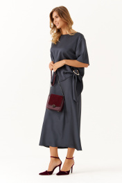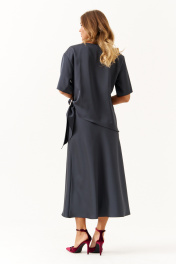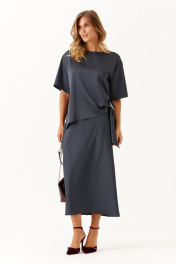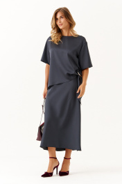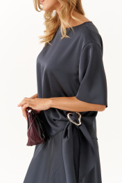 Стильный и комфортный костюм для повседневной носки состоит из блузки и юбки. Блузка имеет прямой силуэт с расширенной горловиной, втачными рукавами длиной чуть ниже локтя и аккуратными боковыми разрезами, украшенными декоративным узлом с серебряной пряжкой, что придает образу изысканность. Юбка выкроена по косой, обеспечивая элегантный и плавный силуэт. Верхний срез юбки обработан внутренней резинкой для комфортной посадки, длина модели — до щиколотки, добавляющая женственности и легкости. Этот графитовый костюм сочетает в себе изящество атласа и удобство, прекрасно подходя как для повседневных образов, так и для более официальных мероприятий. 46 Блузка: Длина изделия по спинке - 57см, Длина рукава - 26см, Ширина по груди - 59см, Ширина рукава вверху - 20см; Юбка: Длина юбки - 850см, Ширина по бедрам - 49см, Ширина по низу - 80см, Ширина по талии - 34см;