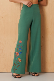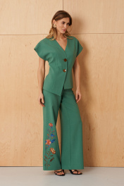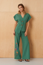Этот женский костюм выполнен из поливискозной ткани, идеально подходящей для повседневной носки за счет своей мягкости и приятной текстуры. Он состоит из жакета и брюк, предоставляя стильное и функциональное решение для различных повседневных случаев. Жакет украшен центральной бортовой застежкой на две обмётанные петли и две пуговицы, что обеспечивает удобство и аккуратное облегание. Передняя часть жакета оформлена двумя вертикальными рельефами, идущими от плечевого шва до линии низа, что создает эффект визуальной вытянутости и стройности. Особенностью является то, что половинки переда и спинки жакета выполнены с разной длиной, что добавляет модели оригинальности. Спинка имеет средний шов и два вертикальных рельефа, идущих от плечевого шва до линии низа, а разрез в боковом шве добавит нотки оригинальности. Горловина V–образная, придающая выразительность образу. Цельнокроеные короткие рукава делают изделие более легким и комфортным, а жакет дополнен поливискозной подкладкой, которая обеспечивает дополнительное удобство и аккуратность кроя. Брюки выполнены в прямом крое, с притачным поясом с внутренней декоративной тесьмой из подкладочной ткани, что добавляет изделию тонкий декоративный акцент. Застежка расположена в боковой части пояса и выполнена на обметанную петлю и потайную застежку-молнию, обеспечивая хорошую посадку. Передняя часть брюк украшена дизайнерской вышивкой в виде веточек цветов, которая придает образу нежность и оригинальность. Задние талиевые вытачки обеспечивают хорошую посадку по фигуре, делая силуэт более аккуратным. Стильный, гармоничный и практичный костюм зеленого оттенка, легко сочетаемый с различной обувью и аксессуарами для создания повседневных и деловых образов. 44 Жакет: Длина изделия - 58.5см, Ширина плеча - 25.5см, Ширина по груди - 46см, Ширина по низу - 50.5см, Ширина рукава - 24см; Брюки: Высота посадки - 27.5см, Длина брюк без пояса - 105.5см, Длина по внутреннему шву - 83.5см, Ширина брючин сверху - 66.5см, Обхват брюк по низу - 61см, Ширина по бедрам - 49.5см, Ширина по талии - 38.5см; 46 Жакет: Длина изделия - 58.5см, Ширина плеча - 25.5см, Ширина по груди - 48см, Ширина по низу - 52.5см, Ширина рукава - 24.5см; Брюки: Высота посадки - 28см, Длина брюк без пояса - 105.5см, Длина по внутреннему шву - 83.5см, Ширина брючин сверху - 68.5см, Обхват брюк по низу - 62.5см, Ширина по бедрам - 51.5см, Ширина по талии - 40.5см;