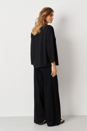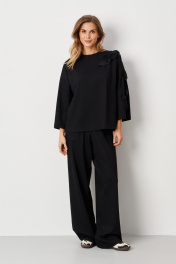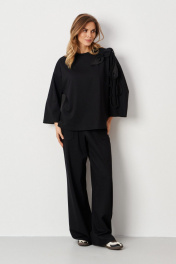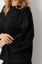 Этот женский джемпер выполнен из мягкого трикотажного полотна с большим добавлением хлопка, что делает его особенно приятным к телу, комфортным в носке и хорошо сохраняющим форму. Модель обладает прямым силуэтом с линией плеча, выполненной в спущенном стиле, что обеспечивает свободную и расслабленную посадку, а также легкость движений. Горловина аккуратно обработана окантовочной тесьмой, что придает изделию завершенный и аккуратный внешний вид, подчеркивая его стильность. Длинные втачные рукава плотно облегают руки, создавая комфорт и аккуратность в посадке. Передняя часть украшена декоративными лепестками, которые начинаются от рукавов и идут вниз, создавая выразительный и оригинальный эффект, привлекающий внимание и добавляющий модели изюминку. Джемпер выполнен в классическом черном оттенке, что делает его универсальным и легким в сочетании с различными предметами гардероба, позволяя создавать как повседневные, так и более элегантные образы. 50 52 54