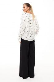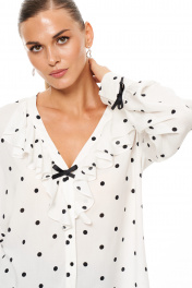 Блузка женская из вискозного волокна для повседневной носки прямого силуэта. Блузка в черный горошек. Перед имеет рюши вдоль горловины. Застежка центральная бортовая на обметанные петли и пуговицы. Спинка с кокеткой и складками. Горловина V-образная. Рукава втачные длинные, низ рукава обработан притачной манжетой с застежкой на обметанные петли и пуговицы. В качестве декора имеются притачные бантики по манжете и горловине. Очень красивая и изящная блузка которая подарит вам легкость и комфорт в носке, главное с ней вы всегда будете в центре внимания. 48 Блузка: Длина изделия - 63см, Длина рукава - 59.5см, Ширина плеча - 15.4см, Ширина по груди - 61см, Ширина по низу - 61.5см, Ширина рукава - 21.1см;
