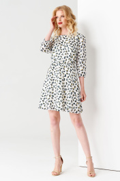 Нарядное платье в нежный принт. Платье без воротника, с овальным вырезом горловины. Рукав 3/ 4, расширенный, по нижнему срезу собран на резинку. Платье отрезное по линии талии, со сборкой на резинку. Перед и юбка на подкладке. 42 Платье: Длина изделия - 90см, Длина рукава - 47см, Ширина плеча - 10.5см, Ширина по груди - 47см, Ширина по подрезу - 32см, Ширина рукава - 17см;