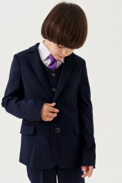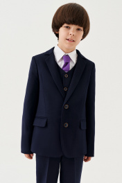 Строгий пиджак для мальчика из поливискозной ткани на вискозной подкладке. Пиджак полуприлегающего силуэта, удлиненный, с центральной застежкой на две петли и пуговицы до перегиба лацкана. Детали переда с отрезными бочками, передними вытачками и боковыми прорезными карманами с клапаном. На левом лацкане отделочная петля. Спинка со средним швом. Рукава втачные двухшовные,с настрочными налокотниками, локтевые швы заканчиваются декоративными шлицами. На шлицах по четыре отделочные петли и пуговицы. Воротник пиджачного типа с тупыми концами. Пиджак с притачной по низу подкладкой.