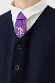 Классический жилет для мальчика полуприлегающего силуэта с центральной застежкой на шесть петель и пуговиц, с V -образным вырезом горловины. Перед жилета цельный. По переду расположены боковые прорезные карманы в рамку. Спинка со средним швом и с рельефными швами, идущими от проймы до низа изделия. По спинке регулятор в виде кулиски с протянутой патой, застёгивающаяся на петлю-пуговицу. Пата внутри кулисы с резинкой. Жилет на подкладке.