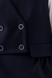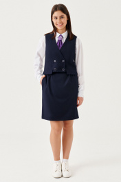 Трендовый жилет для девочки из вискозной ткани на поливискозной подкладке. Силуэт жилета полуприлегающий. Перед жилета с талиевыми вытачками, двубортный. Вырез горловины жилета V- образный. Застежка расположена на переде на прорезную петлю с глазком и пуговицей и потайную пуговицу с петлей. Пуговицы на переде так же выполняют декоративную функцию. На нижних частях переда в области талиевых вытачек расположены притачные клапаны. Спинка жилета со средним швом. Жилет станет отличным решением для создания сдержанного и утонченного образа школьницы. Отлично выступит в комбинациях как с брюками, так и с юбкой.