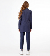 Жакет повседневный для девочки из полувискозной ткани с рисунком в тонкую полоску на вискозной подкладки. Жакет полуприлегающего силуэта, с втачными рукавами. Жакет двубортный с застежкой на пуговицы. Детали переда с отрезными бочками, горизонтально расположенными боковыми прорезными карманами с клапаном в рамку и вытачками от разрезов карманов. Рукава двухшовные. Воротник пиджачного типа. Такой жакет отлично сочетается как с брюками, так и с юбками, создавая современный образ школьника. 44 Жакет: Длина изделия - 75см, Длина рукава - 62см, Ширина плеча - 11см, Ширина по бедрам - 54см, Ширина по груди - 50см, Ширина рукава - 17.5см;