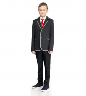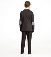 Строгий пиджак для мальчика из трикотажного полотна на вискозной подкладки. Пиджак полуприлегающего силуэта, удлиненный, с центральной застежкой на две петли и пуговицы до перегиба лацкана.Детали переда с отрезными бочками, передними вытачками и боковыми прорезными карманами в рамку. На левой детали переда верхний прорезной карман с листочкой. Спинка со средним швом, заканчивающимся шлицей. Рукава втачные двухшовные, локтевые швы заканчиваются шлицами. На шлицах по четыре отделочные петли и пуговицы. Воротник пиджачного типа с тупыми концами. Пиджак с притачной по низу подкладкой. На деталях подкладки обработан внутренний карман и вешалка. Край воротника, лацкана, борта обработан притачным кантом. 32 Пиджак: Длина изделия - 48см, Длина рукава - 46.5см, Ширина плеча - 9.5см, Ширина по груди - 36см, Ширина по низу - 37см, Ширина рукава - 13.5см; 32 Пиджак: Длина изделия - 51см, Длина рукава - 49см, Ширина плеча - 10см, Ширина по груди - 36см, Ширина по низу - 37см, Ширина рукава - 13.5см; 34 Пиджак: Длина изделия - 51см, Длина рукава - 49см, Ширина плеча - 10см, Ширина по груди - 38см, Ширина по низу - 39см, Ширина рукава - 14см; 38 Пиджак: Длина изделия - 57см, Длина рукава - 54см, Ширина плеча - 11см, Ширина по груди - 42см, Ширина по низу - 43см, Ширина рукава - 15см;