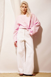 Джинсы женские "wide leg" в белом цвете с высокой посадкой на поясе. Верхний край обработан притачным поясом со шлевками, застегивающийся на джинсовую пуговицу-болт. Спереди застежка на молнию по гульфику. Также обработаны боковые джинсовые карманы. Боковой шов смещен на передние половинки брюк. Сзади обработаны большие прямоугольные накладные карманы, а также горизонтальный подрез в области колена.