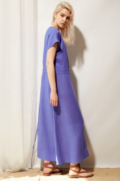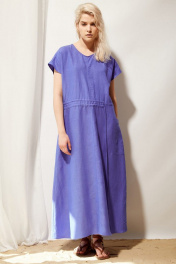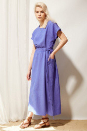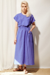 Платье женское в стиле oversize из льняной ткани в цвете кобальт, отрезное по линии талии. Линия плеча спущена, горловина круглой формы. По талии кулиса с двумя шнурами для регулировки степени приталивания. Сбоку платья обработан один большой накладной карман.