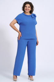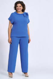 Костюм женский, свободного кроя. Состоит из блузки и брюк. По переду блузки у горловины распологается декоративный элемент - кокилье. Спинка с центральным швом, вверху которого расположен разрез - капелька. Воротник - стойка фантазийная. Рукав на манжете. Внизу боковых швов находяся разрезы. Длина изделия по линии спинки в размерах 48, 50, 52 - 62 см, а в размерах 54, 56, 58 - 64 см. Длина рукава с плечевым срезом в р 48, 50, 52 - 23см, а в размерах 54, 56, 58 - 26см. Ширина изделия по линии груди в 48р - 52см, в 50р - 54см, в 52р - 56см, в 54р - 58см, в 56р - 60см, в 58р - 62см. Брюки свободного кроя, прямого силуэта, с карманами в подрезном бочке передних половинках брюк. Пояс брюк на эластичной тесьме. Ширина пояса брюк (полуобхват, эластичная тесьма в свободном положении) Длина брюк по боковому с поясом 107 см., по шаговому в размерах 48, 50, 52 - 81см, а в размерах 54, 56, 58 - 79 см. Ширина пояса с резинкой в свободном положении в полуобхвате. р 48 - 35см, р 50 - 37см, р 52 - 39см, р 54 - 41см. р 56 - 43см, р 58 - 44см. Ширина по линии бедер р 48 - 56см, р 50 - 58см, р 52 - 60см, р 54 - 62см. р 56 - 64см, р 58 - 66см