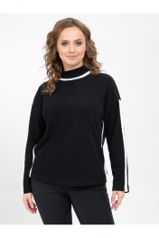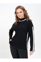 Джемпер свободного силуэта, втачного покроя. Линия плеча естественная. Это придает более четкую форму плечевого пояса, и аккуратный вид всего изделия. Пройма неглубокая, умеренно широкая. По линии груди, талии и бедер изделие свободно прилегает к фигуре. Спинка целая. Плечо спущено. Воротник стойка. По верхнему срезу рукава, горловины и бокового шва обработана декоративная вставка черного (белого) цвета. Длина изделия по спинке в размере 48 - 64см, 50 - 65см, 52 - 66см, 54 - 67см, 56 - 68см, 58 - 69см. Длина рукава по верхнему срезу вместе с плечевым в размерах 48, 50, 52 - 67см, а в размерах54, 56, 58 - 68см. Ширина по линии груди в размере 48 - 58см, 50 - 59см, 52- 60см, 54 - 61см, 56 - 62см, 58 - 63см.