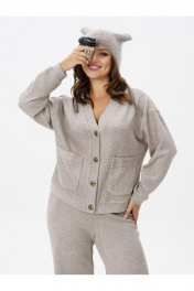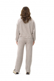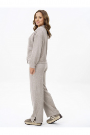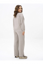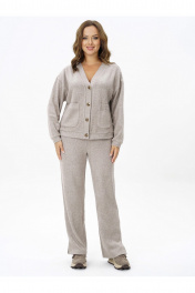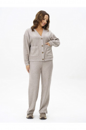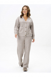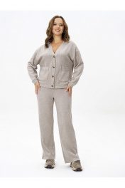 Костюм прямого силуэта, состоящий из жакета и брюк. Линия плеча естественная. Это придает более четкую форму плечевого пояса, и аккуратный вид всего изделия. Пройма неглубокая, умеренно широкая. По линии груди, талии и бедер изделие свободно прилегает к фигуре. Спинка целая. На переде обработаны накладные карманы. По краю борта переда и горловине спинки идет планка, которая застёгивается на 4 петли и 4 пуговицы. Внизу изделия притачной пояс. Рукав втачной, внизу рукава манжета. Брюки свободного силуэта, широкие внизу, пояс на резинке.По боковому шву внузу брюк обработаны разрезы. Низ брюк обработаны на плоскошовной машине. Длина джемпера по спинки в размерах 46, 48 и 50 - 59см, 52 - 63см, ширина джемпера под проймой в размере 46 - 54см, 48 - 57 см, 50 - 60см, 52 - 63см, длина рукава джемпер с плечевым швом в размере 46-50 - 68 см, 52 - 70 см, длина брюк в размерах 46, 48 и 50 -106см, 52 -107см, ширина брюк на уровне линии бедер в размере 46 - 50см, 48 - 52см, 50 - 54см, 52 - 56см.