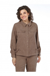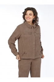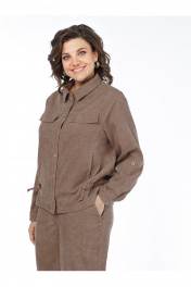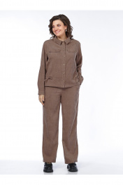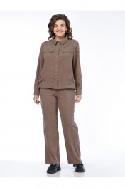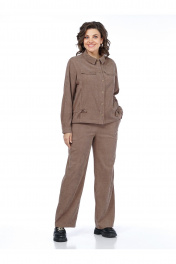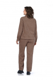 Костюм прямого силуэта, состоящий из жакета и брюк. Линия плеча естественная. Это придает более четкую форму плечевого пояса, и аккуратный вид всего изделия. Пройма неглубокая, умеренно широкая. По линии груди, талии и бедер изделие свободно прилегает к фигуре. Длина жакета до линии бёдер. В верхней части спинки кокетка с отделочной строчкой по шву притачивания. На переде обработана кокетка выше линии груди, по шву притачивания кокетки обработаны клапаны. Конструктивные линии переда - рельефы, которые идут от проймы до низа. В области талии в рельефе расположен карман в шве. Ниже линии талии обработам пояс с кулиской до рельефа. Рукав втачной длинный, внизу с манжетой на петлю и пуговицу. Длину рукава можно регулиравать патой. По переду обработаны планки, которые застёгиваются на петли и пуговицы, воротник стояче-отложной воротник. Брюки свободного силуэта, прямые от бедра, пояс на резинке. В брюках на передних половинках обработаны карманы с подрезным бочком.