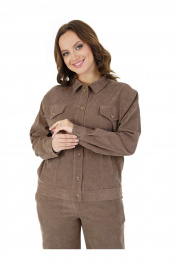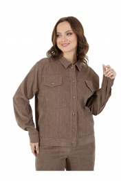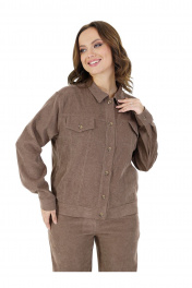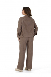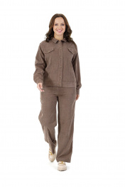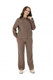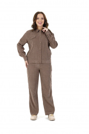 Костюм прямого силуэта, состоящий из жакета и брюк. Линия плеча естественная. Это придает более четкую форму плечевого пояса, и аккуратный вид всего изделия. Пройма неглубокая, умеренно широкая. По линии груди, талии и бедер изделие свободно прилегает к фигуре. Длина жакета до линии бёдер. В верхней части спинки кокетка с отделочной строчкой по шву притачивания. На переде обработана кокетка выше линии груди, по шву притачивания кокетки обработаны карманы с клапанами. Конструктивные линии переда - рельефы, которые идут от кокетки до низа. Рукав втачной длинный, внизу с манжетой на петлю и пуговицу. По переду обработаны планки, которые застёгиваются на петли и пуговицы, воротник стояче-отложной воротник. Брюки свободного силуэта, прямые от бедра, пояс на резинке. В брюках на передних половинках обработаны карманы с подрезным бочком. Длина изделия по спинке 46,48 - 61см, 50,52 - 62см, ширина по линии груди под проймой 46 - 56см, 48 - 58см, 50 - 60см, 52 - 62см, длина рукава во всех размерах 59см, длина дрюк 46,48 - 106см, 50,52 - 1074см, ширина бёдер 46 - 54см, 48 - 56см, 50 - 58см, 52 - 60см, длина по шаговому шву во всех размерах 77см, ширина пояса с эластичной тесьмой в свободном положении 46 - 34см, 48 - 36см, 50 - 38см, 52 - 40см.