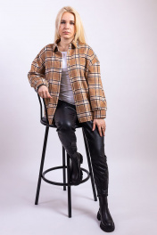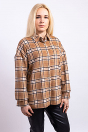 Рубашка женская, повседневная, свободного силуэта на 6 пуговиц со спущенным плечевым швом. Перед и спинка цельнокроеные. Рукав одношовный, нижний срез со сборкой и манжетой. Воротник сорочечного типа со стойкой. Длина рубашки 77 см, рукава 45 см Размеры на этикетке сдвоенные: 42-44, 44-46, 46-48