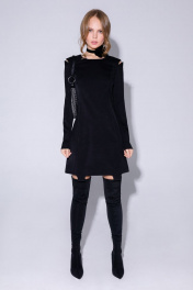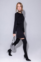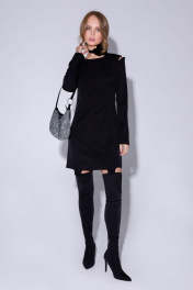Текстильное платье-футляр длины мини с фигурным низом и вырезами по рукавам. Детали: прилегающий силуэт, рельефные швы переда и спинки, круглая горловина, втачные длинные рукава с декоративным вырезом по окату, потайная застежка в среднем шве спинки, фигурный низ, без подкладки. Длина по спинке около 81,5/84,5 см, длина рукава около 60 см