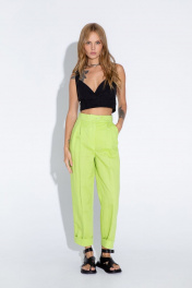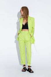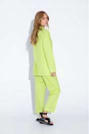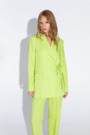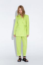 Льняной костюм- тройка из жакета, топа-бюстье и брюк со складками Детали: жакет прямого силуэта, отрезные бочки, пиджачный воротник, застежка-завязки, функциональные карманы, рукава и спинка со шлицами, жакет на подкладке из 100% вискозы. Топ без застежки, широкие бретели с резинками, сборка по низу чашки лифа, прилегание достигается за счет эластичных бретелей. Брюки с высокой посадкой, притачной пояс со шлевками, задняя часть пояса эластичная- с резинкой, застежка на молнию и пуговицу, боковые карманы, передние половины с двумя складками Длина жакета по спинке около 71 см в размерах 40-46 и около 75 см в размерах 48-52 Длина рукавов около 62 см Длина топа от плечево шва около 37 см в размерах 40-46 и около 39 см в размерах 48-52 Длина брюк по боковому шву с поясом около 99,5 см в размерах 40-46 и около 101 см в размерах 48-52, длина по внутреннему шву около 70 см