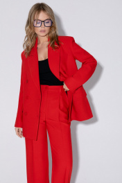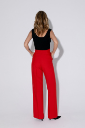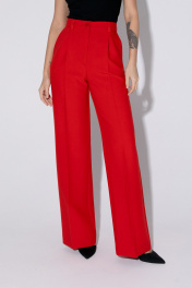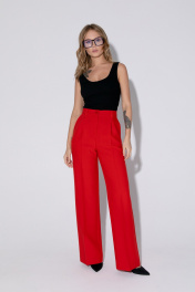 Текстильные брюки-палаццо с высокой посадкой. Детали: высокая посадка, широкие и длинные брюки, притачной пояс со шлевками, передние половины с небольшими застроченными мягкими складками и заутюженными стрелками, застежка на молнию и пуговицу, боковые карманы Длина брюк по боковому шву с поясом около 113 в размерах 40-46 и около 114,5 см в размерах 48-52 Длина по внутреннему шву ок