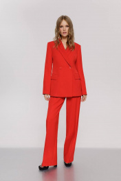 Классический приталенный жакет из текстильной ткани. Детали: жакет с отрезными бочками и нагрудными вытачками, пиджачный воротник, прорезные карманы, двубортная застежка на петли и пуговицы, спинка со средним швом, втачные двухшовные рукава, жакет на подкладке Длина по спинке около 68 в размерах 40-46 и около 71 см в размерах 48-52, длина рукавов около 61 см
