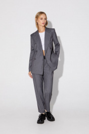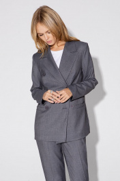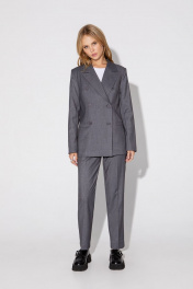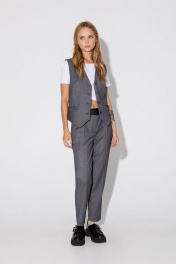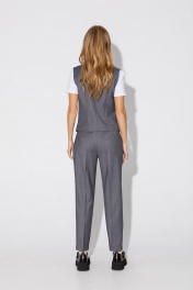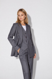 Классический костюм-тройка из двубортного жакета, полуприлегающего жилета и укороченных брюк со стрелками. Детали: жакет полуприлегающего силуэта, пиджачный воротник, перед с прорезными карманами, двубортная застежка на петли и пуговицы, спинка со средним швом, рукава втачные двухшовные, жакет на подкладке. Жилет полуприлегающего силуэта, фигурный низ, талиевые вытачки, застежка на петли и пуговицы, функциональные карманы, на подкладке. Брюки со средней посадкой, притачной пояс со шлевками, передние половины с небольшими мягкими складками и заутюженными стрелками, застежка на молнию и пуговицу, боковые карманы. Длина жакета по спинке около 66 см в размерах 40-46 и около 69 см в размерах 48-52, длина рукавов около 61 см. Длина жилета по спинке около 48,5 см в размерах 40-46 и около 51,5 см в размерах 48-52. Длина брюк по боковому шву с поясом около 97 в размерах 40-46 и около 98,5 см в размерах 48-52, длина по внутреннему шву около 70 см.