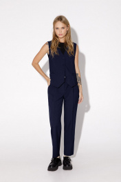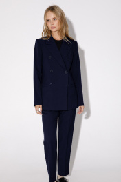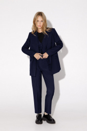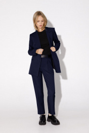 Классический костюм-тройка из двубортного жакета, полуприлегающего жилета и укороченных брюк со стрелками. Детали: жакет полуприлегающего силуэта, пиджачный воротник, перед с прорезными карманами, двубортная застежка на петли и пуговицы, спинка со средним швом, рукава втачные двухшовные, жакет на подкладке. Жилет полуприлегающего силуэта, фигурный низ, талиевые вытачки, застежка на петли и пуговицы, функциональные карманы, на подкладке. Брюки со средней посадкой, притачной пояс со шлевками, передние половины с небольшими мягкими складками и заутюженными стрелками, застежка на молнию и пуговицу, боковые карманы. Длина жакета по спинке около 66 см в размерах 40-46 и около 69 см в размерах 48-52, длина рукавов около 61 см. Длина жилета по спинке около 48,5 см в размерах 40-46 и около 51,5 см в размерах 48-52. Длина брюк по боковому шву с поясом около 97 в размерах 40-46 и около 98,5 см в размерах 48-52, длина по внутреннему шву около 70 см.