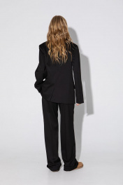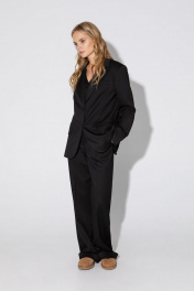 Текстильный костюм-двойка из оверсайз жакета и прямых брюк-палаццо со стрелками. Детали: жакет прямого силуэта, расширенная линия плеч, пиджачный воротник, перед с прорезными функциональными карманами, однобортная застежка на петли и пуговицы, спинка со средним швом и шлицей, рукава втачные двухшовные, жакет на подкладке. Брюки с высокой посадкой на притачном поясе со шлевками, застежка на молнию и пуговицу, боковые карманы, передние половины с заутюженными стрелками и двумя небольшими складками. Длина жакета по спинке около 69 см в размерах 40-46 и около 72 см в размерах 48-52, длина рукавов около 62 см. Длина брюк по боковому шву с поясом около 113 см в размерах 40-46 и около 114,5 см в размерах 48-52, длина по внутреннему шву около 82 см.